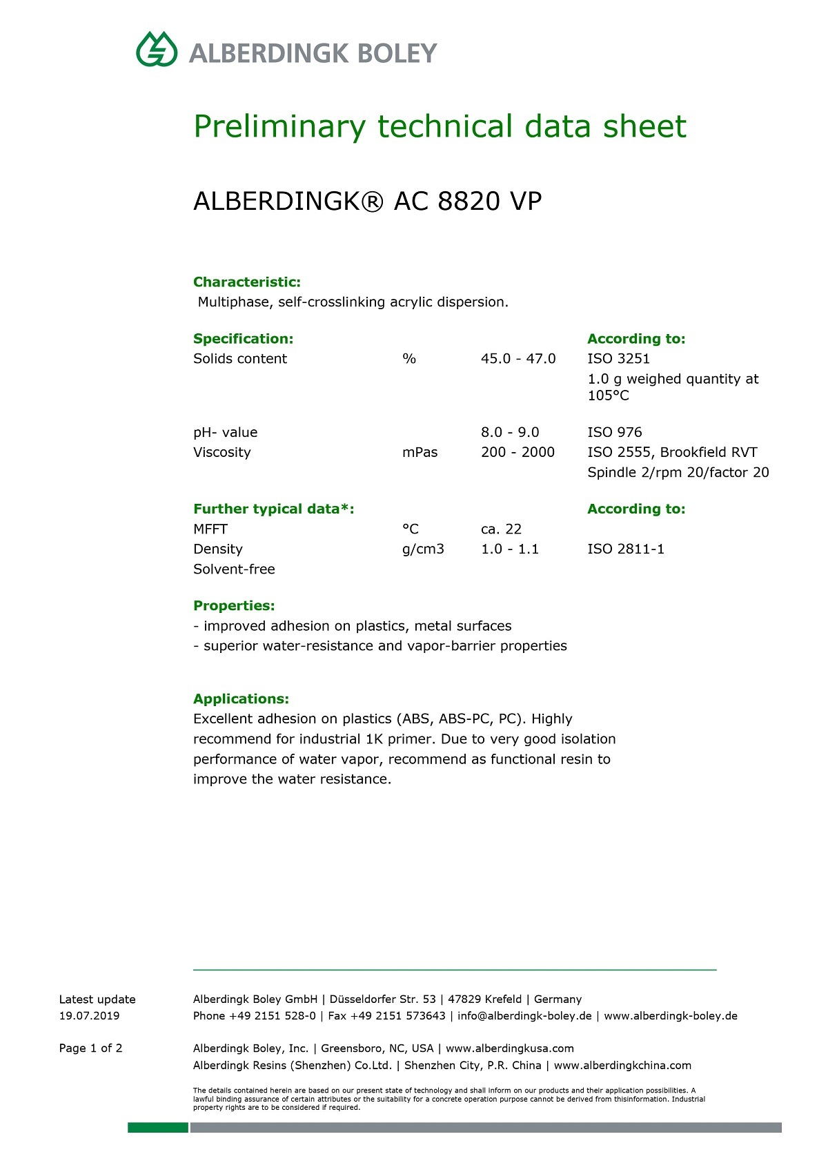 歐(ou)寶迪(di)Alberdingk AC8820水性(xing)單組(zu)分塑(su)膠底(di)漆用(yong)樹脂(zhi)産品(pin)