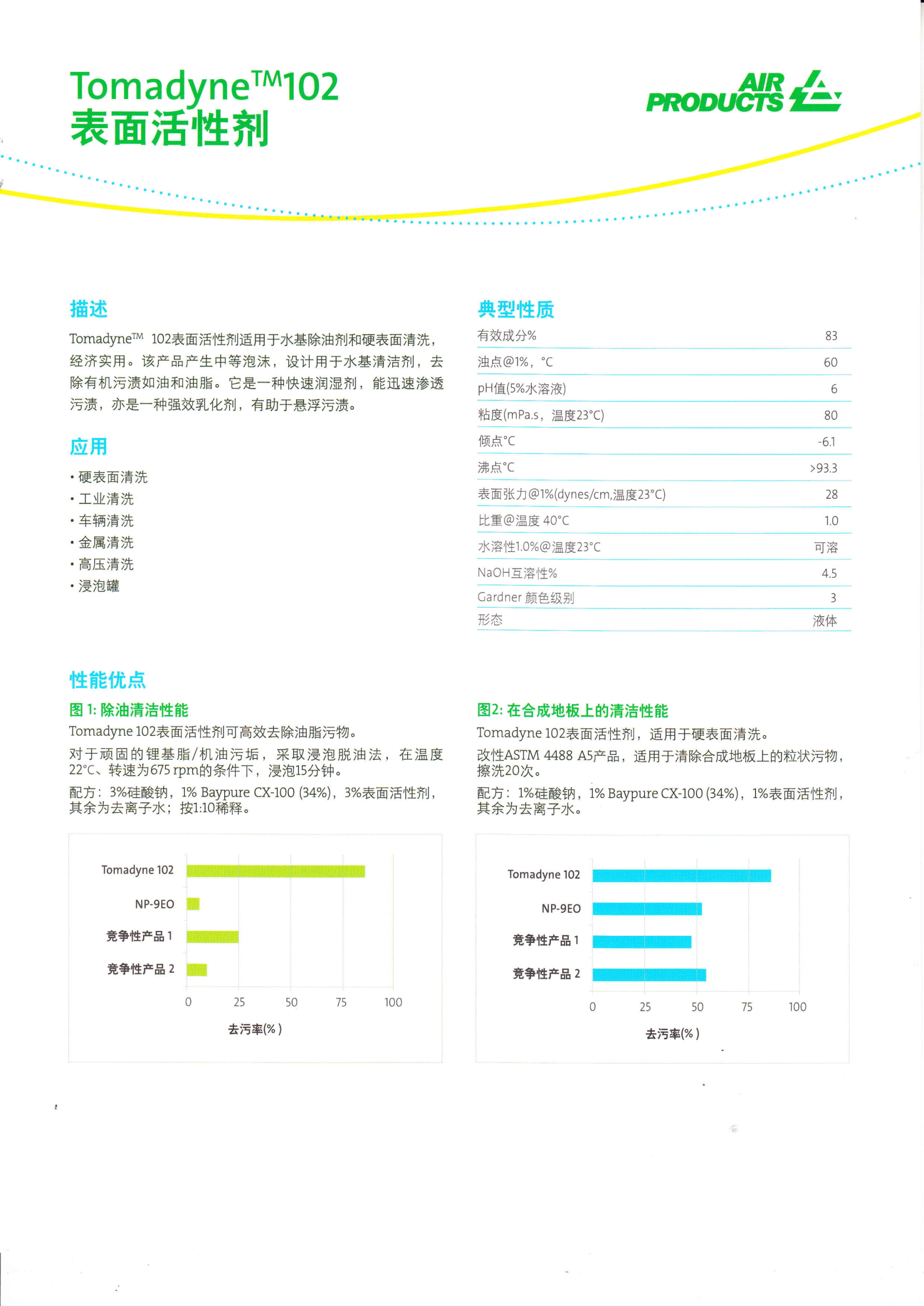 Tomadyne 102表面(mian)活性劑适(shi)用于水基(ji)除油劑和(he)硬表面清(qing)洗,經濟實(shi)用。 該産品(pin)産生中等(deng)泡沫,設計(ji)用于水基(ji)清潔劑,去(qu)除有機污(wu)漬如油和(he)油脂。 它是(shi)— 種快速潤(run)濕劑😝,能迅(xun)速滲透污(wu)漬,亦是一(yi)種強💕效乳(ru)化劑,有助(zhu)于懸浮污(wu)漬。