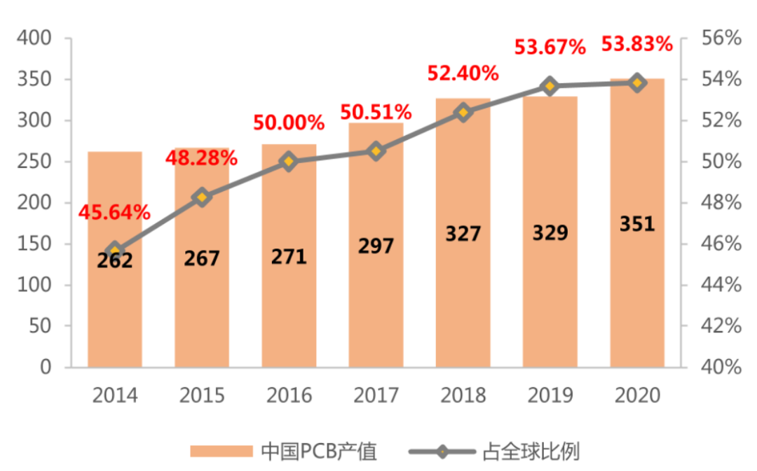 從2006年開(kai)始,中國(guo)的PCB産值(zhi)便超過(guo)了日本(ben)成爲了(le)全球最(zui)大的生(sheng)産基地(di),2020年産值(zhi)占比更(geng)是達到(dao)了全球(qiu)的53.8%。有趣(qu)的是,盡(jin)管全球(qiu)的PCB市場(chang)呈現了(le)一定的(de)周期性(xing),但中國(guo)的PCB産值(zhi)卻在不(bu)斷攀升(sheng)😗,2020年國内(nei)PCB闆行業(ye)産值規(gui)模達超(chao)過350億美(mei)元。