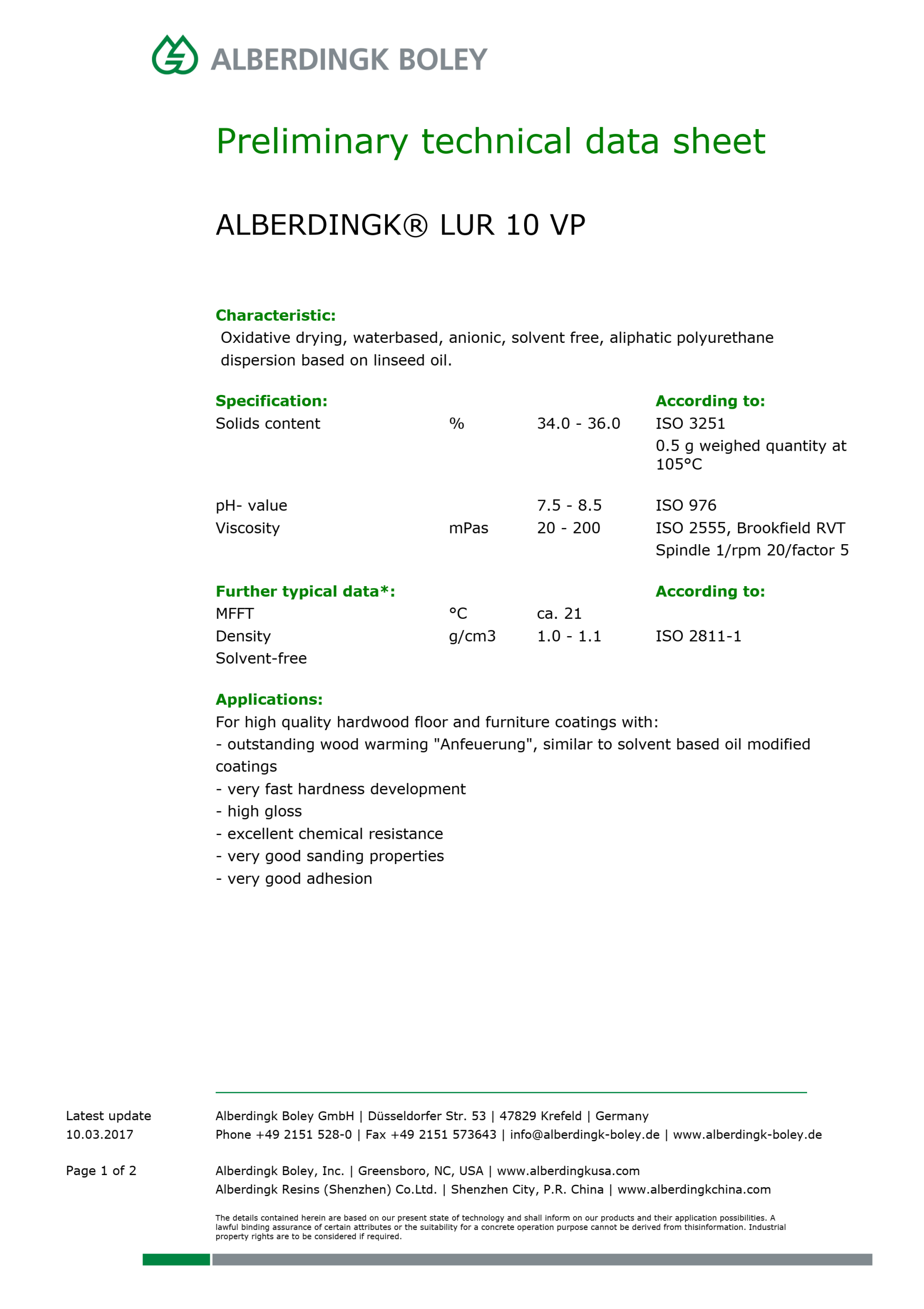 ALBERDINGK是(shi)一家(jia)成立(li)于1828年(nian)的專(zhuan)業綠(lü)色環(huan)保水(shui)性塗(tu)料用(yong)樹脂(zhi)👼🏾原☠️材(cai)料的(de)德國(guo)私人(ren)家族(zu)企業(ye)。公司(si)創立(li)之初(chu)就是(shi)從事(shi)亞麻(ma)油,蓖(bi)麻油(you)植物(wu)基産(chan)品的(de)生産(chan)研發(fa)。基于(yu)自身(shen)在蓖(bi)麻✍🏻油(you)、亞麻(ma)油植(zhi)物基(ji)原材(cai)料在(zai)塗料(liao)工業(ye)應用(yong)中的(de)190多年(nian)的沉(chen)澱積(ji)累,ALBERDINGK已(yi)經陸(lu)續開(kai)發了(le)多👀種(zhong)木器(qi)家具(ju)、地闆(pan)塗料(liao)應用(yong)的優(you)質植(zhi)物油(you)基的(de)水性(xing)聚氨(an)酯分(fen)散體(ti)産品(pin),如ALBERDINGK CUR995、ALBERDINGK CUR991、ALBERDINGK LUR3和(he)ALBERDINGK LUR10等産(chan)品,而(er)ALBERDINGK LUR10是結(jie)合👨🦰目(mu)前中(zhong)國家(jia)具👺塗(tu)料市(shi)場油(you)轉水(shui)階段(duan)對水(shui)性木(mu)器塗(tu)料産(chan)品性(xing)能升(sheng)級之(zhi)迫👩🏽🐰👩🏿切(qie)需求(qiu),而最(zui)新研(yan)發并(bing)成功(gong)推✍🏻向(xiang)市場(chang)的亞(ya)麻油(you)植物(wu)基高(gao)光高(gao)豐滿(man)度水(shui)性脂(zhi)肪族(zu)聚氨(an)酯分(fen)散體(ti)産品(pin)。