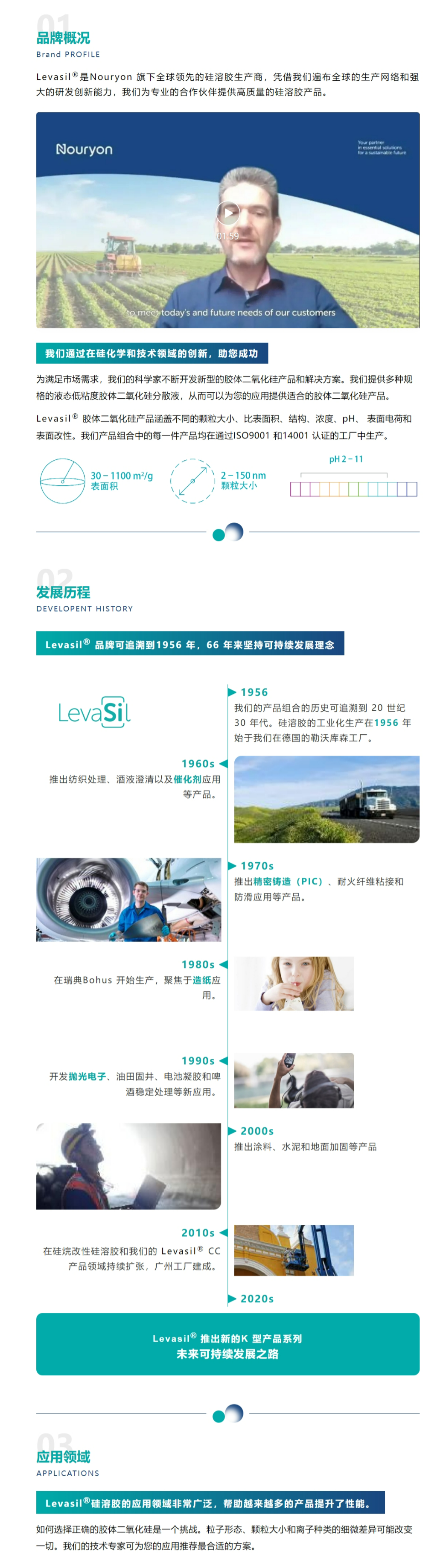 Levasil®是Nouryon(諾(nuo)力昂) 旗下(xia)全球領先(xian)的矽溶膠(jiao)生産商,憑(ping)借我們遍(bian)布全球的(de)生産網絡(luo)和強大的(de)研發創新(xin)能力,我們(men)爲專業的(de)合作夥伴(ban)提供高質(zhi)量的矽溶(rong)膠産品。Levasil® 矽(xi)溶膠的工(gong)業化始于(yu)1956年我們在(zai)德國的勒(le)沃庫森工(gong)廠。66年來,我(wo)們的産品(pin)已廣泛應(ying)用于造紙(zhi),塗料,建築(zhu),電子,催化(hua)劑,鑄造,油(you)田服務,水(shui)處理等領(ling)域,爲越來(lai)越多的産(chan)品提升性(xing)能,幫助世(shi)界各地的(de)客戶獲得(de)成功。